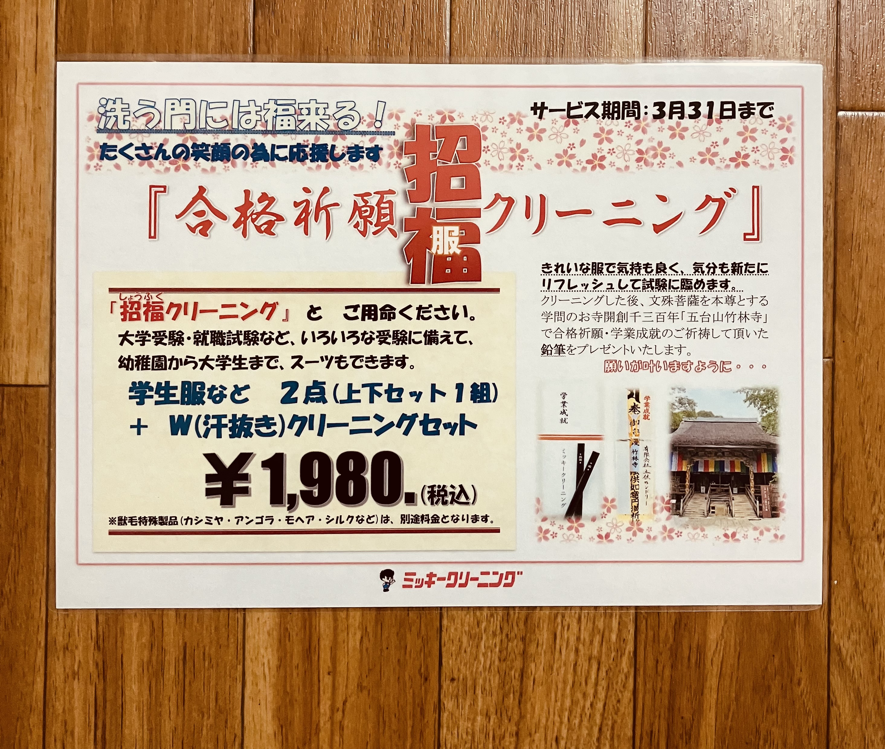 受験シーズン到来です。受験生の皆さんを応援📣 2026年3月31日迄 キャンペーン❗️ 学生服やスーツ上下2点を汗ぬきクリーニングセットで、本尊 智恵の文殊菩薩『五台山竹林寺』にて合格祈願を御祈祷して頂いたオリジナル鉛筆✏️プレゼント❗️ 入学試験や就職活動に、気分新たにリフレッシュした洋服で臨みませんか? 🌸たくさんの笑顔の為に応援します🌸 詳しくはスタッフまで。